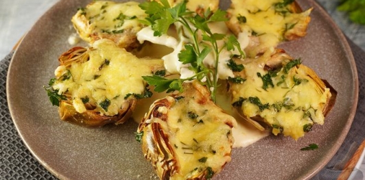 Нежные запечённые артишоки с насыщенной сливочно-сырной начинкой – изысканное блюдо с тонким ореховым вкусом. Лёгкая обжарка подчёркивает аромат артишоков, а сливки и расплавленный сыр делают текстуру мягкой и сочной.