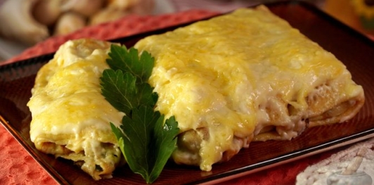 Продукты Молоко – 600 мл Яйца – 4 шт. Мука – 200 г Масло растительное – 1 ст. ложка + для жарки Соль – ½ ч. ложки * Для грибной начинки: Шампиньоны – 300 г Вешенки – 200 г Грибы сушеные – 20 г Лук репчатый – 200 г Масло сливочное – 30 г Мука – 1 ст. ложка Орех мускатный молотый – 1 щепотка Майоран – 1 щепотка Петрушка свежая – 1–2 ст. ложки Соль – по вкусу Перец чёрный молотый – по вкусу * Для сливочного соуса: Сыр твёрдый – 120-150 г Сливки 20-30% – 400 мл Масло сливочное – 20 г + для смазывания формы Мука – 1 ст. ложка Соль – по вкусу