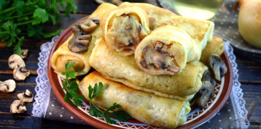 Тонкие румяные блинчики наполняются аппетитной начинкой из нежного картофельного пюре и обжаренных грибов с луком. Мягкое пюре прекрасно сочетается с золотистыми шампиньонами и луком, а лёгкая обжарка на сливочном масле придаёт готовым блинчикам аппетитную хрустящую корочку. Подавайте их со сметаной или любимым соусом.