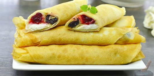 Продукты (на 8 порций) Тесто: Яйца куриные – 4 шт. Соль – 1 щепотка Сахар – 3 ст.л. Ванильный сахар – 10 г Вода комнатной температуры – 250 мл Молоко – 500 мл Мука пшеничная – 370 г Крахмал кукурузный – 30 г Масло растительное – 2 ст.л. Сливочное масло растопленное – 50 г Кипяток крутой – 250 мл * Вишневая начинка: Вишня без косточки – 300 г Сахар – 2 ст.л. Кукурузный крахмал – 1 ст.л. * Творожная начинка: Творог 5 % – 300 г Сметана 15 % – 3 ст.л. Сахар – 2 ст.л. Ванильный сахар – 10 г Сгущенное молоко – 2 ст.л. * Маковая начинка для пирогов – 300 г
