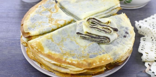 Продукты (на 10 порций) Тесто: Молоко – 400 мл Вода – 100 мл Мука пшеничная – 200 г Яйца – 3 шт. Масло топленое – 40 г Сахар – 60 г Соль – 10 г * Маковая начинка: Мак – 100 г Вода – 200 мл Сгущенное молоко – 100 г Сливочное масло – 25 г Мед – 25 г Цедра лимона сушеная – 5 г