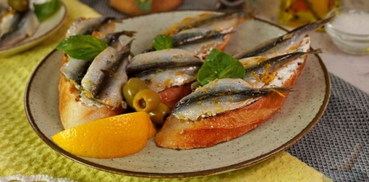 Простая и яркая закуска — маринованные анчоусы на брускетте с фетой и оливками. Сочетание солёных анчоусов с цитрусовым привкусом, нежной феты и оливок на поджаренном хлебе создаёт яркий средиземноморский вкус. Прекрасно подойдёт к аперитиву, бокалу вина или в качестве лёгкой закуски к ужину.