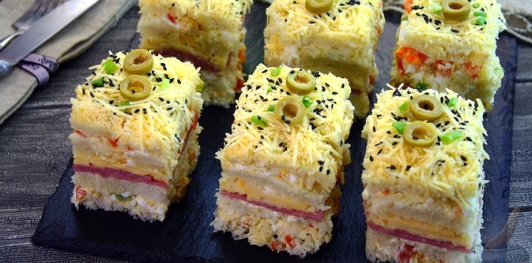 Продукты (на 12 порций) Тостовый хлеб (2 упаковки) — 900 г Ветчина — 230 г Сыр пластинками — 170 г (+ 70 г сыра для украшения) Капуста пекинская (или салат Айсберг) — 250 г Помидоры — 200 г Оливки — 60 г Яйца — 5 шт. Перец сладкий (у меня замороженный) — 200 г Майонез — 320 г * Для маринования и запекания перца: Сахар — 0,5 ч. ложки Соль — 0,3 ч. ложки Уксус яблочный — 2 ч. ложки Масло растительное — 2 ст. ложки Чеснок — 1-2 зубчика * Для украшения (по желанию): Кунжут чёрный — 1-2 ч. ложки Лук зелёный — 3-5 г