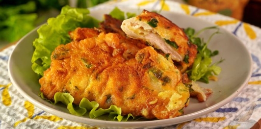 Жареное куриное филе в кляре с черемшой подавайте к столу со свежей зеленью.