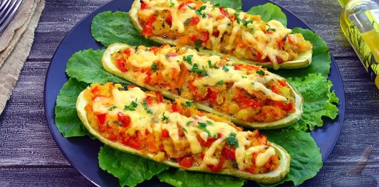 Нежные лодочки из кабачков, наполненные сочной овощной начинкой. Замечательный вкусовой букет! С расплавленным сыром — еще вкуснее и питательнее. Готовятся просто, украсят любой стол!