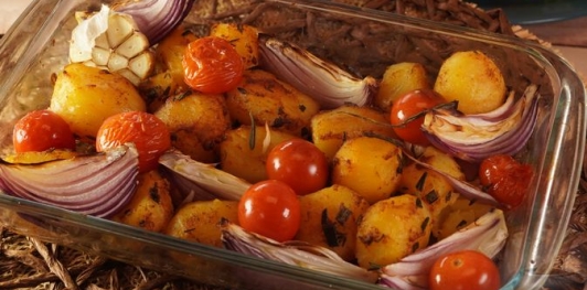 Картофель, запечённый с пряностями, красным луком и помидорами, подаётся как гарнир к основным блюдам — рыбе, мясу и грибам, например.