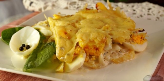 Простое и сытное блюдо из доступных ингредиентов. Отварной картофель и яйца нарезаются кружочками и выкладываются слоями вместе с луком. Сливочная заливка пропитывает каждый слой, делая запеканку сочной и мягкой. Румяная сырная корочка завершает внешний вид и вкус.
