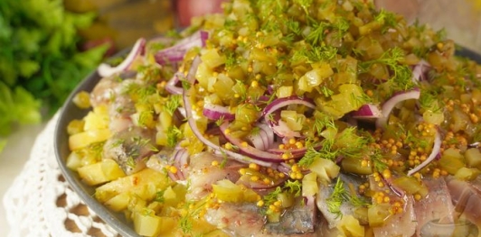 Продукты Картофель — 650 г Сельдь матиас — 500 г Лук красный — 150 г Огурцы маринованные — 250 г Укроп — 20 г * Соус винегрет: Масло оливковое — 100 мл Соль — 1/2 ч. ложки Перец чёрный молотый — 1/2 ч. ложки Лимон — 0,5 шт. (для 30 мл сока) Горчица — 30 г