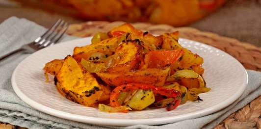 Яркое овощное блюдо с необычным компонентом — тыквой. Овощи обжариваются, а затем запекаются, — это придаёт им насыщенный вкус. Пряности добавляют свой замечательный аромат. Аппетитно, очень вкусно и вполне сытно!