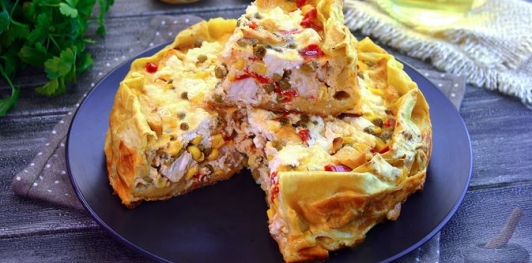 В этом кише вместо классического песочного теста используется тонкий лаваш, который после запекания становится удивительно нежным. Начинка из сочной курицы, сладкой кукурузы, болгарского перца и зелёного горошка делает блюдо ярким и сытным, а заливка из сливок с ноткой бургерного соуса придаёт пикантность.