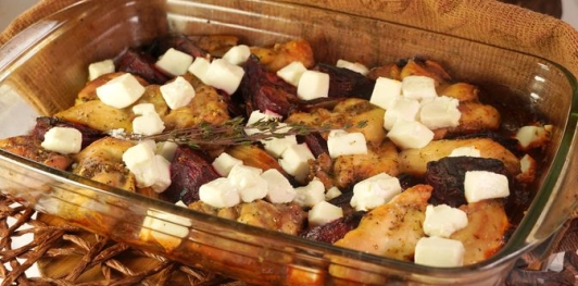 Курица запекается со свёклой и луком в духовке до красивой румяной корочки. Под конец запекания добавляется сыр фета. В итоге получается полноценное сытное блюдо на ужин или обед.