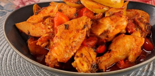 Продукты (на 4 порции) Куриные крылышки — 820 г Айва — 420 г (в очищенном виде — 310 г) Перец болгарский красный — 200 г Лук репчатый — 150 г Кинза — 20 г Томатный соус — 200 г Паприка молотая — 1 ч. ложка Приправа для курицы — 1 ч. ложка Травы итальянские сушёные — 1 ч. ложка Перец чёрный молотый — 1/8 ч. ложки Перец красный острый молотый — 1/8 ч. ложки (по вкусу) Соль — 1/2 ч. ложки (по вкусу) Масло растительное — 30 мл (2 ст. ложки)