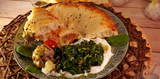 В этом блюде прохладная, бархатистая основа из лабне сочетается с тёплой, ароматной зеленью и нежнейшим печёным чесноком. При запекании молодой чеснок теряет резкость и становится мягким, сладковатым, почти кремовым — его легко выдавить прямо на лепёшку. Лимонная цедра и сок добавляют свежести, а заатар и оливковое масло завершают блюдо яркими восточными акцентами.