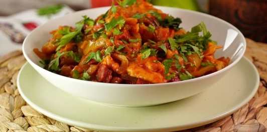 Лечо с колбасками и клёцками подаём горячим, посыпав измельчённой зеленью.
