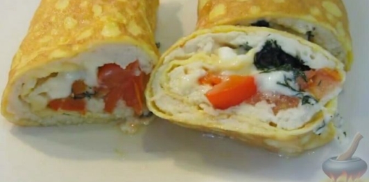 Делаем яичные блины из 7 яиц. Каждый блин — это 1 яйцо, 1 столовая ложка молока и немного соли. Для блина соединяем яйцо с солью и молоком.