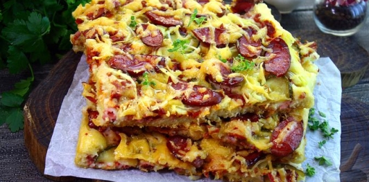 Ленивый пирог-пицца с колбасой и сыром готов.