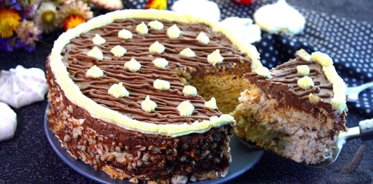 Бока торта смазываем шоколадным кремом и присыпаем орехами. Украшаем остатками белого и шоколадного крема. Отправляем торт в холодильник еще на 1 час.