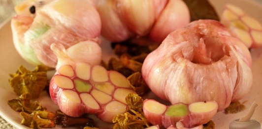 В ходе пребывания в маринаде природная жгучесть молодого чеснока уступает благородной пряности. Виноградный уксус, лимонный сок и сахар сохраняют упругость и цвет зубчиков и дарят им сложную кисло-сладкую вкусовую гамму. А листья смородины, гвоздика и душистый перец обогащают палитру аромата.