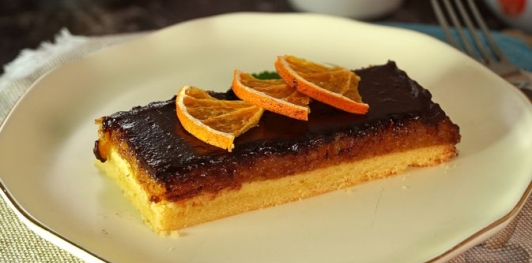 Этот пирог готовится из песочной основы, цитрусового слоя из апельсинов и лимонов с миндалем и шоколадной глазури. Яркая кислинка джема оттеняет сладость коржа и горечь темного шоколада, делая десерт выразительным и гармоничным.