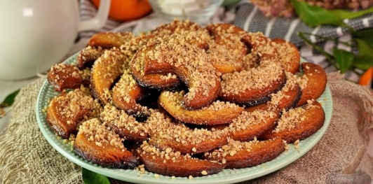 Раскатываем тесто в пласт толщиной 5 мм. Вырезаем формой полумесяцы. Выкладываем на противень, застеленный пергаментом. Ставим в разогретую до 180 °C духовку на 25-30 минут.