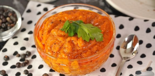 Переливаем содержимое сковороды в глубокую ёмкость и пробиваем блендером до однородной пюреобразной консистенции.