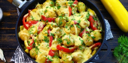 Золотистая картошечка с ароматом сливочного масла, чеснока и пряностей. Её превосходно дополняют сочные овощи и аппетитно расплавленный сыр. Отличное самостоятельное блюдо! Но можно подать его и в качестве гарнира.