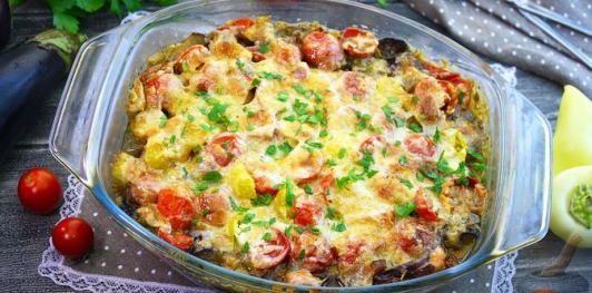 Овощи в компании ароматных трав и оливкового масла превращаются в настоящий праздник вкуса. Баклажаны, цукини, сладкий перец сперва запекаются отдельно. Затем сверху выкладываются помидоры черри и тёртый сыр, который при последующем запекании образует золотистую корочку.