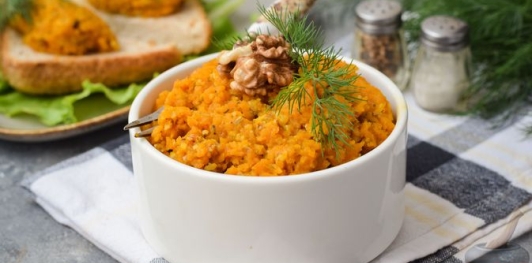 Вкусный, полезный и аппетитный морковный паштет с грецкими орехами. Паштет получается ярким не только по внешнему виду, но и по вкусу. Такая закуска отлично подойдёт для перекуса, также паштетом можно наполнить тарталетки или просто подать с хлебом. Сладковатый вкус моркови отлично гармонирует с грецкими орехами, а пикантный акцент задаёт чеснок.