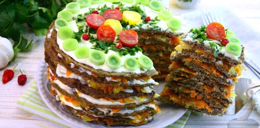 Тонкие нежные блинчики из говяжьей печени прослаиваются сочной начинкой из золотистого лука и моркови, а майонез делает торт мягким и гармоничным по вкусу. После непродолжительного охлаждения слои становятся плотнее, и закуска легко нарезается аккуратными кусочками.