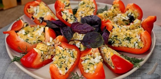 Простая и быстрая в приготовлении закуска. Нежная начинка гармонично сочетается с хрустящим сочным перцем — замечательный вкусовой баланс. Благодаря перцу — ярко, за счет зелени и чеснока — ароматно. Рецепт наверняка пригодится.