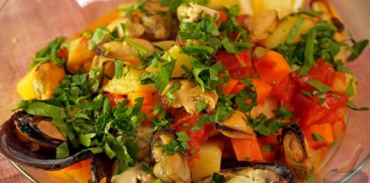 Продукты Мидии (мясо) — 300 г Вода или бульон от мидий — 100 мл Картофель — 250 г Помидоры — 160 г Морковь — 180 г Корень сельдерея — 50 г Масло оливковое — 75 мл Чеснок — 5-6 зубчиков Соль — 1 ч. ложка Перец чёрный молотый — 1/2 ч. ложки * Для украшения (по желанию): Мидии в ракушках — 150 г Петрушка свежая — 1 пучок (небольшой) Лимон — по вкусу