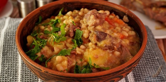 Продукты (на 4 порции) Баранина (лопатка на кости) — 760 г Бекон копчёный — 100 г Фасоль белая — 250 г Картофель — 400 г Сельдерей (корень) — 200 г Морковь — 100 г Перец сладкий — 220 г Лук репчатый фиолетовый — 200 г Чеснок — 8 г Лавровый лист — 1 шт. Соль — по вкусу Перец чёрный молотый — по вкусу Масло растительное — 30 г Зелень — по вкусу (для подачи)