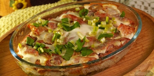 Сытное и ароматное блюдо с ярким весенним акцентом. Обжаренное мясо придаёт насыщенный вкус, а отварной рис делает блюдо сбалансированным. Черемша добавляет свежую, слегка чесночную нотку, которая раскрывается при запекании. В духовке все ингредиенты соединяются, пропитываясь ароматами друг друга.