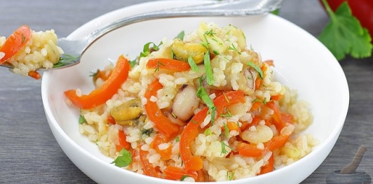 Рис с морепродуктами и болгарским перцем готов к подаче.