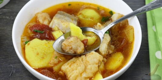 Продукты (на 6 порций) Филе пангасиуса – 900 г Картофель – 500 г Бульон куриный – 500 мл Корень имбиря – 60 г Масло растительное – 25 мл Зелень петрушка – 10 г Чеснок – 5 г (1 зубчик) Томаты, консервированные в собственном соку – 450 г Сахар – 5 г (по вкусу) Перец красный молотый острый – по вкусу Соль – по вкусу Перец черный молотый – по вкусу