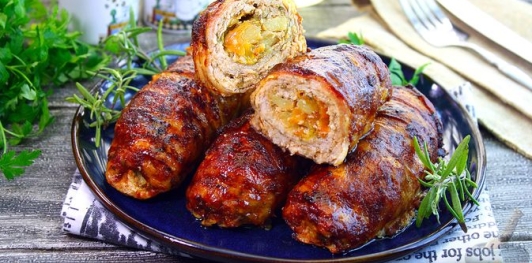 Тонко отбитые ломтики свинины сначала маринуются в ароматных специях, затем наполняются мягким картофелем и сладким перцем, сворачиваются в рулеты и оборачиваются беконом. Во время запекания бекон подрумянивается и придаёт мясу особую сочность. А пикантная глазурь с горчицей, уксусом и соусом чили создаёт аппетитную румяную корочку и насыщенный вкус.