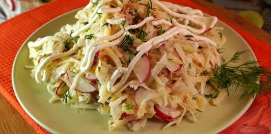 Нежная кольраби гармонично сочетается с хрустящим редисом по вкусу и текстуре. Яблоко и лимонный сок добавляют сочность и свежесть. Заправляется салат оригинально – взбитыми сливками.