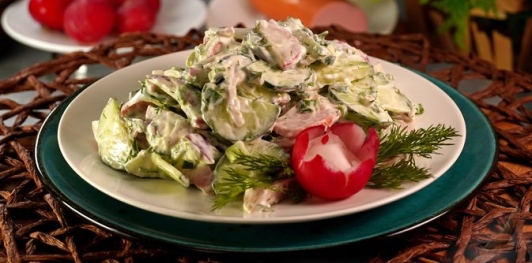 Свежий, хрустящий и при этом сытный салат на каждый день. Сочные редис и огурцы создают лёгкую основу, колбаса добавляет насыщенности, а зелень — яркий аромат. Нежная сметанно-майонезная заправка с мягкой горчичной ноткой объединяет все ингредиенты в гармоничное блюдо.