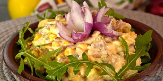 Салат из солёной сельди, с маринованными огурцами, яйцами, кислым яблоком, зелёным горошком и кукурузой. Яблоко добавляет лёгкую кислинку и балансирует солёный вкус сельди, а нежная заправка из сметаны, майонеза и горчицы объединяет все ингредиенты в гармоничное и выразительное блюдо