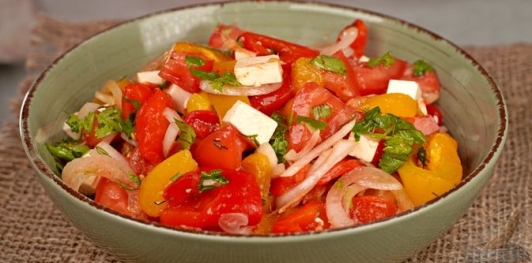 Болгарский перец можно использовать для салатов как в свежем виде, так и в запечённом. Салат из запечённого болгарского перца с помидорами и фетой получается красочным и ароматным. Особенно яркий аромат блюду придаёт запекание болгарского перца, а также добавление свежего имбиря.