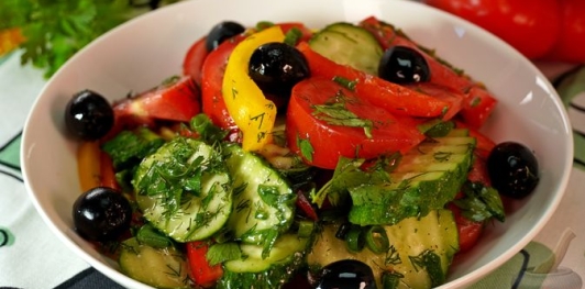 Яркий сочный салат похож на греческий, но более лёгкий. Пикантные маслины отлично дополняют свежие овощи и зелень. Простые продукты гармонично соединяются и превращаются в праздничное блюдо. Салат подойдёт к мясу, в качестве закуски, или как самостоятельный перекус.