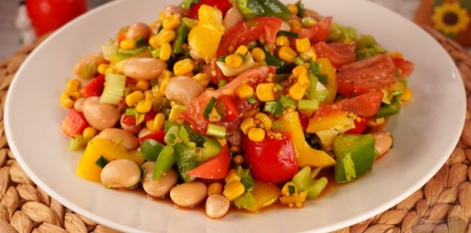 Продукты Фасоль консервированная белая — 220 г Перец болгарский — 300 г Помидоры — 200 г Кукуруза консервированная — 180 г Сельдерей черешковый — 100 г Петрушка — 20 г Лук зелёный — 20 г * Для заправки: Масло оливковое — 3-4 ст. ложки Соевый соус — 2 ст. ложки Горчица зернистая — 20 г Лимонный сок — 20 мл Соль — 1 ч. ложка Перец чёрный молотый — по вкусу
