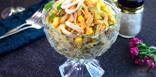 Продукты (на 4 порции) Кальмар очищенный — 300 г Кукуруза консервированная — 160 г Огурцы маринованные — 180 г Лук репчатый — 100 г Морковь — 170 г Яйца — 2 шт. Соль — 1,4 ч. ложки (по вкусу) Перец черный молотый — 0,4 ч. ложки или по вкусу Майонез — 80 г Имбирь маринованный — 20 г Масло растительное — 20-30 мл Горчица зернистая — 1 ч. ложка