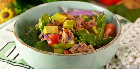 Продукты Тунец консервированный в собственном соку – 280 г Авокадо – 150 г Шпинат – 100 г Помидоры черри – 160 г Лук репчатый красный – 50 г Масло оливковое – 1 ст. ложка Лимон (сок) – 1/4 шт. Соль – по вкусу Перец чёрный молотый – по вкусу
