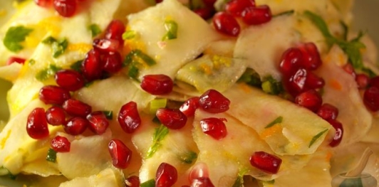 Тончайшие, почти прозрачные слайсы корня сельдерея превращаются в изысканную закуску благодаря яркому маринаду из сока и цедры апельсина и лимона. Короткое бланширование убирает лишнюю резкость, оставляя только чистый хруст и нежность. А свежая зелень и оливковое масло первого отжима завершают этот освежающий ансамбль. Легкое, витаминное и невероятно эстетичное блюдо особенно выигрышно смотрится при подаче с рубиновыми зёрнами граната.
