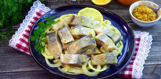 Селёдка, маринованная с луком в горчично-медовом маринаде, готова.