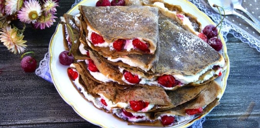 Продукты (на 3 порции) Блины: Мука — 100 г Какао-порошок — 25 г Яйца — 2 шт. Молоко — 250 мл Сахар — 30 г Масло сливочное — 50 г Соль — 0,4 ч. ложки Масло растительное для смазывания сковороды — 5 мл * Начинка: Вишня замороженная (без косточки) — 375 г Сахар — 150 г Творог — 300 г Сметана — 100 г Сахарная пудра — 75 г (+ сахарная пудра для посыпки)