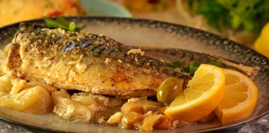 Готовую скумбрию подаём с гарниром и свежими овощами.
