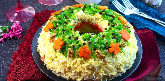 Продукты (на 8 порций) Картофель — 400 г Морковь — 300 г Куриное филе — 300 г Майонез — 150-180 г Орехи грецкие — 50 г Яйца — 4 шт. Лук репчатый — 200 г Соль — 1,5 ч. ложки (по вкусу) Перец чёрный молотый — 0,25 ч. ложки (по вкусу) * Для маринования лука: Уксус 9% — 2 ст. ложки Соль — 1 ч. ложка Сахар — 2 ч. ложки Вода (кипяток) — 250 мл * Для украшения (по желанию): Лук зелёный — 10 г Ягоды барбариса — 1 ч. ложка