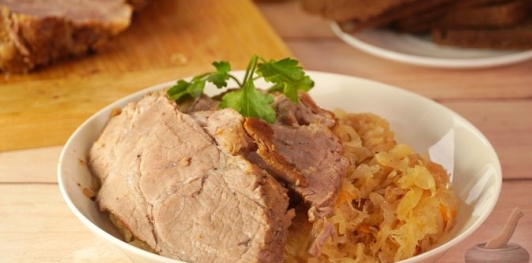 Продукты Свиная шея — 0,5 кг Масло растительное — 50 мл Соль — 1/2 ч. л. Перец чёрный молотый — 1/2 ч. л. Майоран — 1 ч. л. Паприка сладкая — 1/2 ч. л. Чеснок — 3 зубка Лук репчатый — 150 г Капуста квашеная 700 г Яблоко кислое — 200 г Мёд — 1 г Бульон мясной — 100 мл